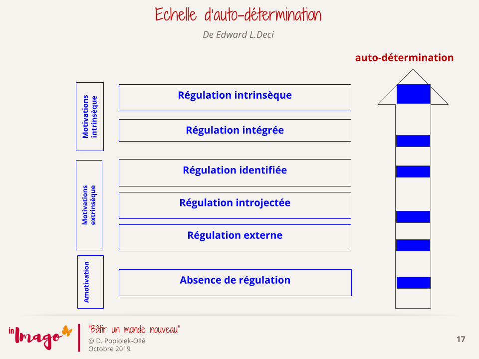 Plus tard, Deci et Ryan organisent ces motivations entre elles suivant une échelle continue de régulation. Ils ne parlent plus de motivation intrinsèque et extrinsèque mais respectivement de motivation autodéterminée et non-autodéterminée.